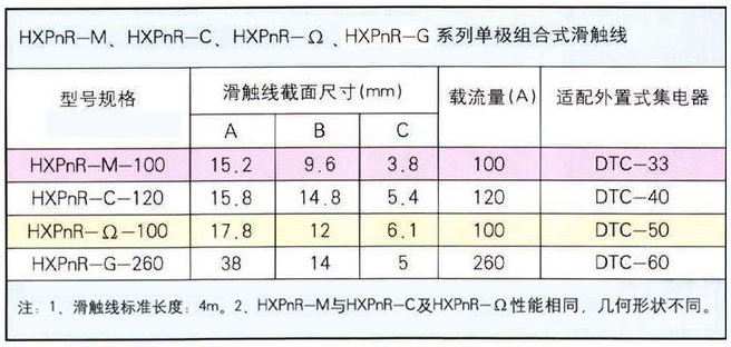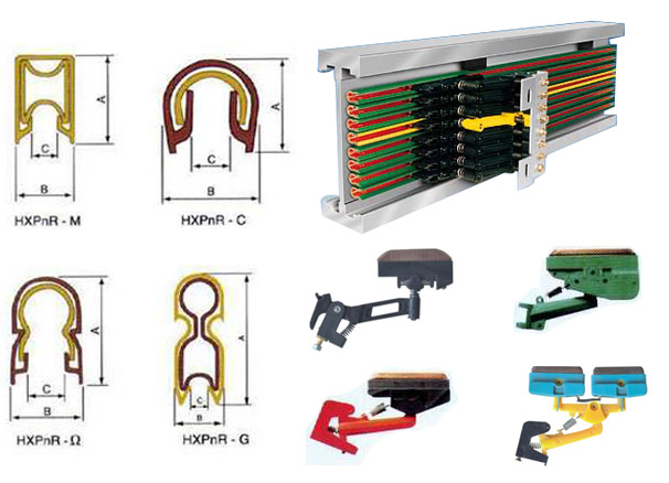 HXPnR-M、HXPnR-C、HXPnR- Ω系列单极组合式滑触线由M型、C型、Ω型铜导管与相配置的PVC绝缘护套、外置式集电器以及与之相对应的支架、端口、喇叭口、接头滑座等组件组合而成。该产品以其体积小、结构紧凑、性能稳定、组合自由等特点被广泛地应用于汽车、邮电、机械、化工、烟草、电器等行业的输送线、检测线作为移动供电和信号传输。