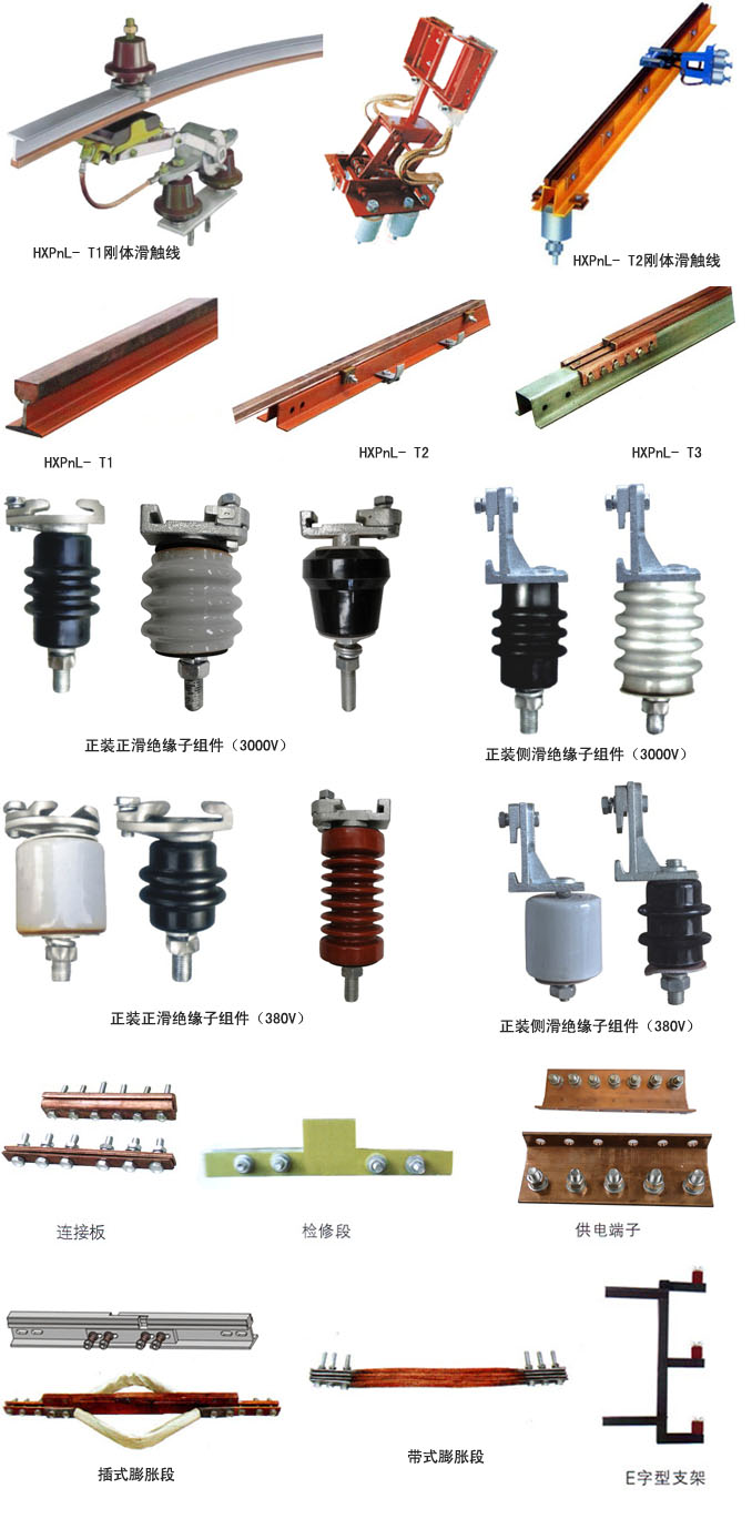 HXPnL- T1系列刚体滑触线由铜导轨、导轨支架、绝缘子组件以及外置式集电器等组件组合而成。 由于该产品具有电流大、耐高温、抗腐蚀等特点,因此被广泛地应用于冶金、造船、港口装卸等行业。 HXPnL- T2由弱尾槽铜棒和高刚度工字钢构成,其嵌装工艺保证了铜棒和工字钢的紧密结合。采用高强度专用绝缘子作支撑,从而组成向各种起重机械城市高架轻轨列车等移动设备馈电的滑触线。